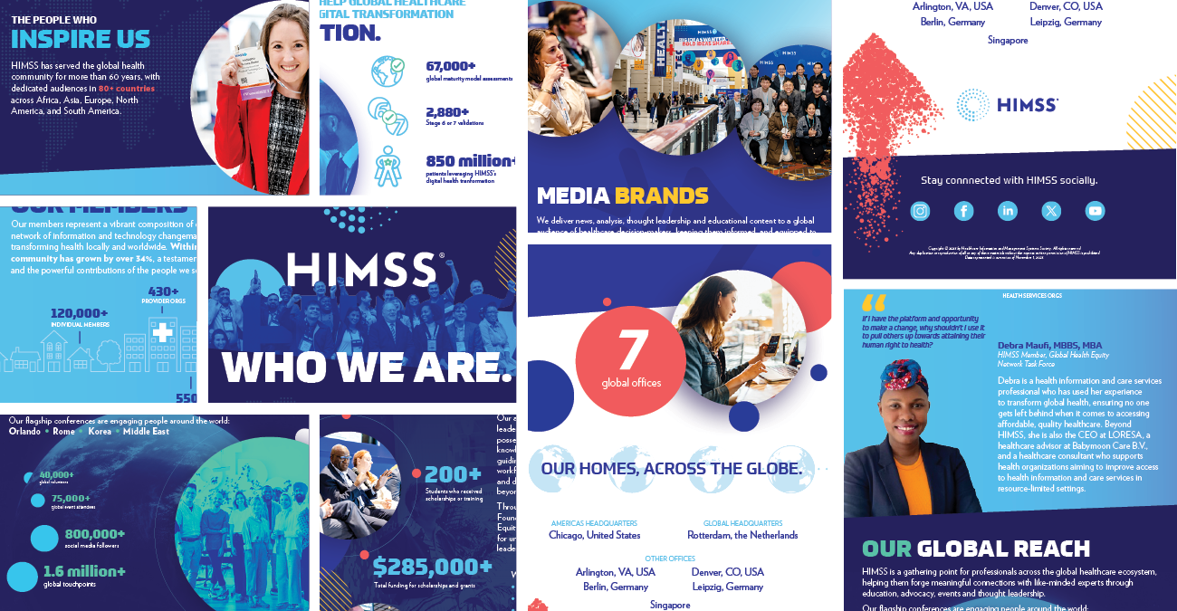 This infographic represents one of the very first pieces created in the newer “2.0” brand evolution, spearheaded by myself. Evolving the HIMSS brand from its 2019 roots included bringing the brand into a modern era with more layout flexibility, depth using layering and angled elements to create interest. The infographic tells the story of HIMSS by guiding viewers through mini “art installations” in each section, creating a unique visual story for each section while keeping the piece cohesive. The digital-first design was later repurposed as a printed tri-fold and PowerPoint slide show. This piece required intensive collaboration with copywriters and stakeholders across the entire organization.